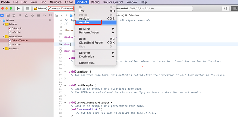 首先在 Xcode 中,将编译的目标机器设置成 “iOS Device”,然后点击”Product”–>“Archive”,如图所示: