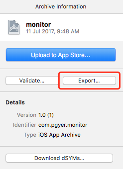 Archive 成功之后,就可以在 Xcode 的 Organizer 中看到相应的文件。然后点击 Organizer 中的 “Export” 按钮,如下图所示: